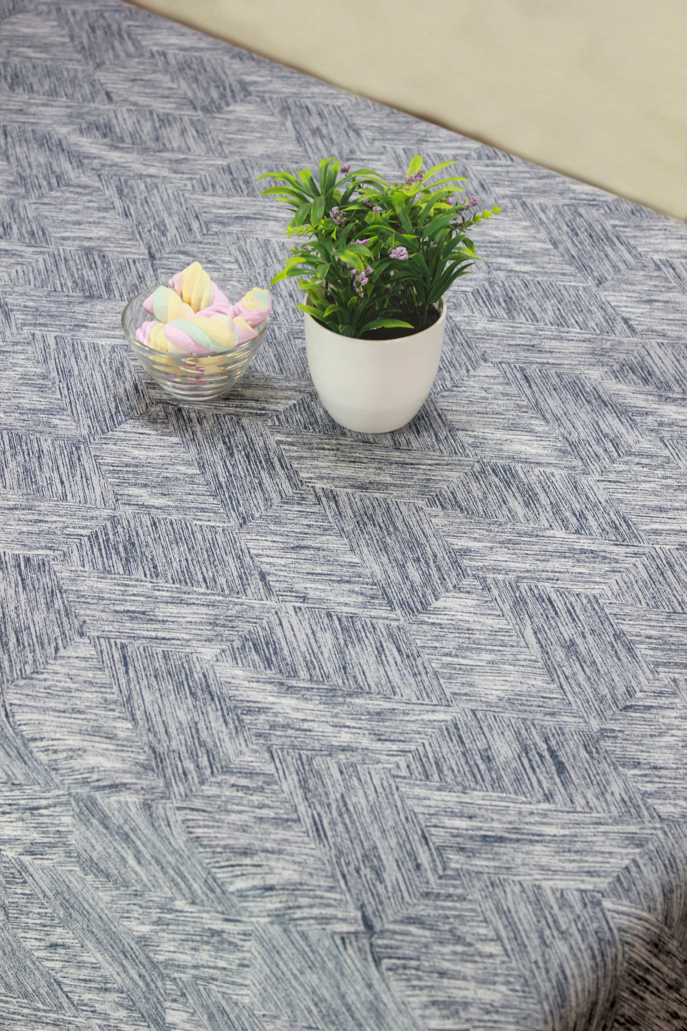 Une nappe enduite lavable avec un imprimé jacquard.